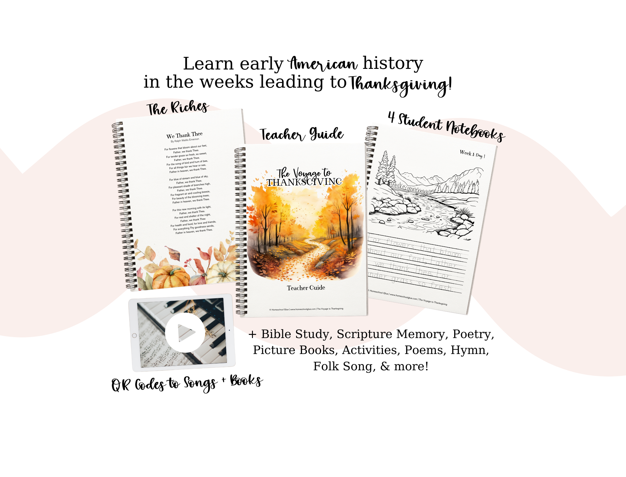 The Voyage to Thanksgiving is a family-style, open-and-go Charlotte Mason-inspired 4-week-long curriculum that teaches the early American history to the whole family (preschool through high school + beyond - parents will learn a lot too) that includes many subjects for a fully-immersive experience!