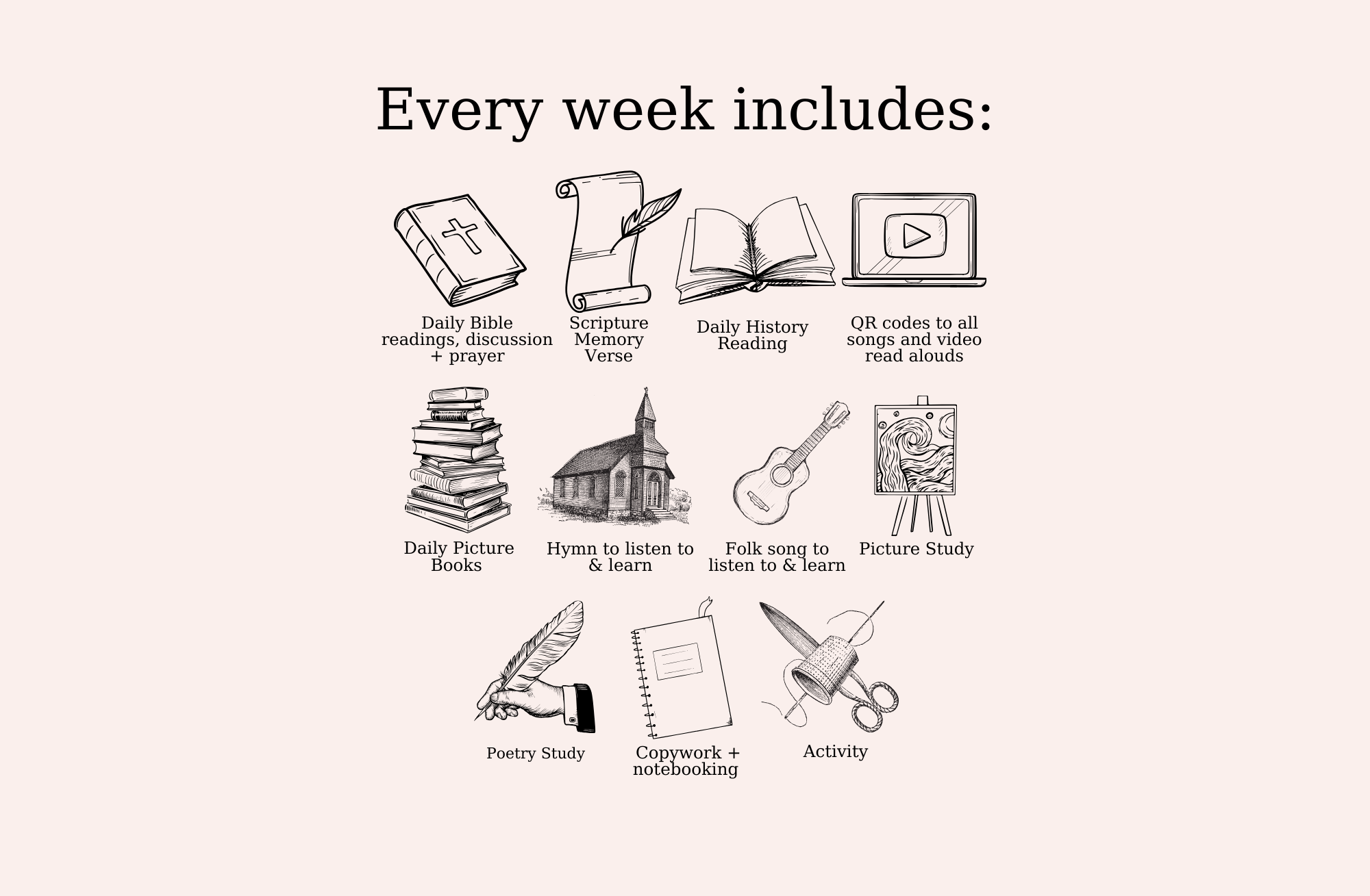 The weekly rotating subjects are poetry study, picture study, hymn, folk song, geography, and an immersive activity.
