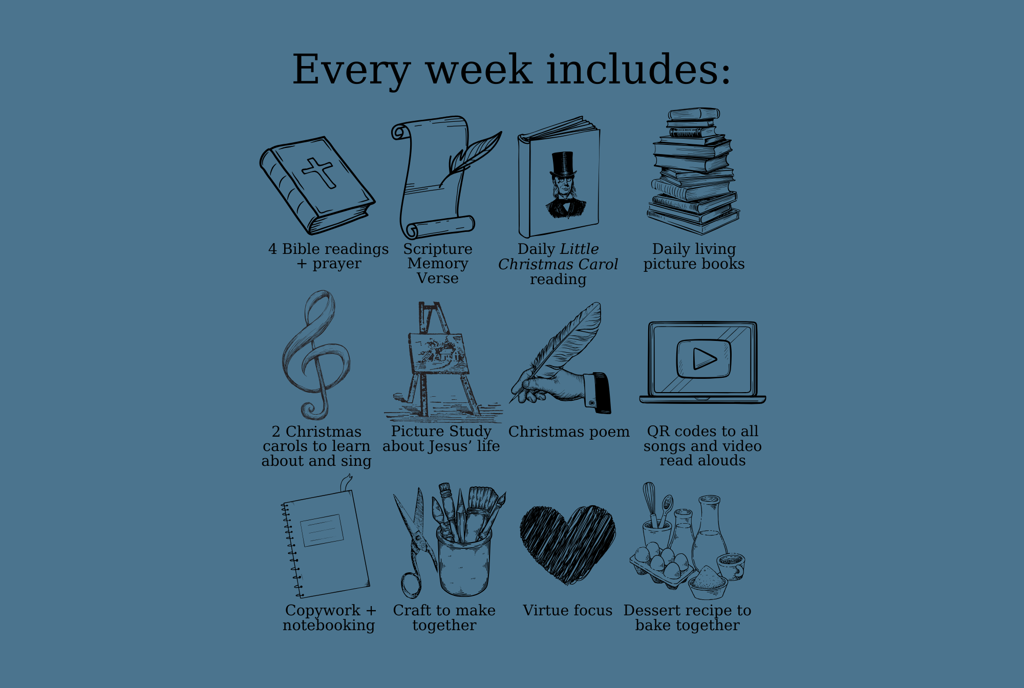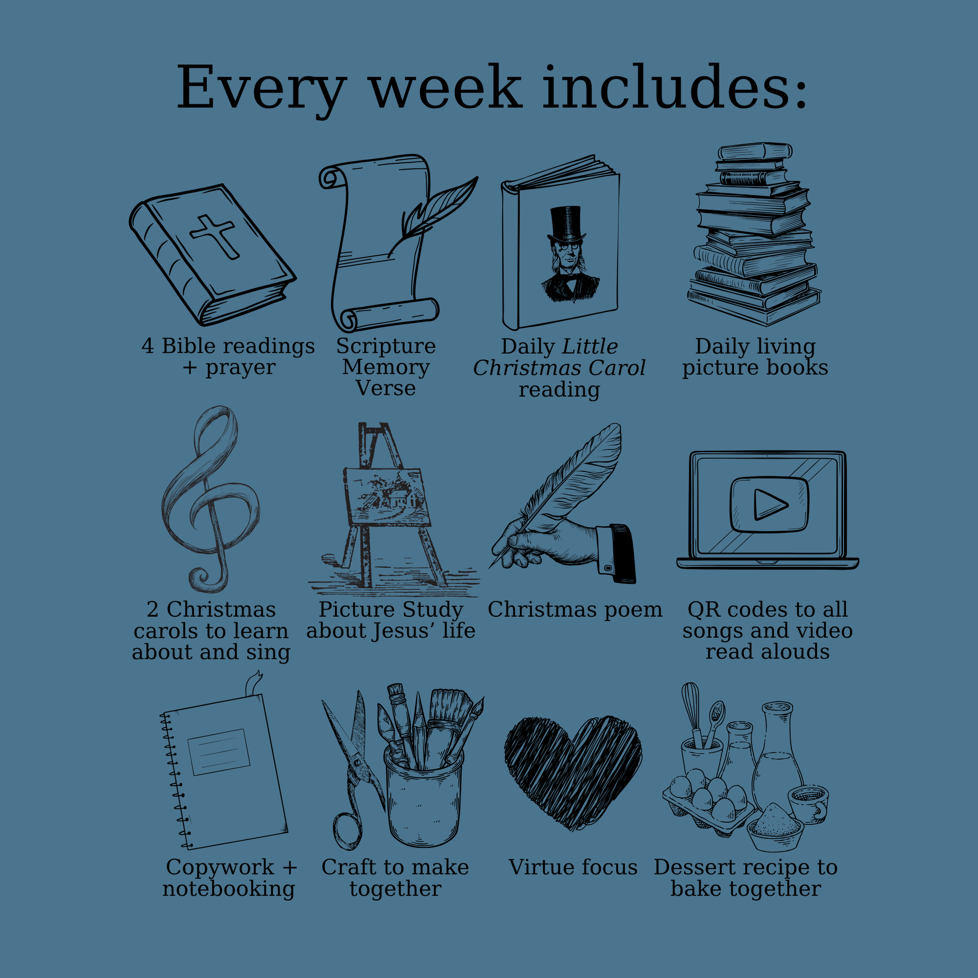 I imagine most families will swap out their normal read aloud, singing time (hymns/folk songs), picture book reading, Bible study, prayer, Scripture memory, handicraft, copywork, etc. for this resource. If you are already incorporating many of those subjects and just swap them out for this resource for the month of December, it shouldn't take much more time than any other homeschool day.