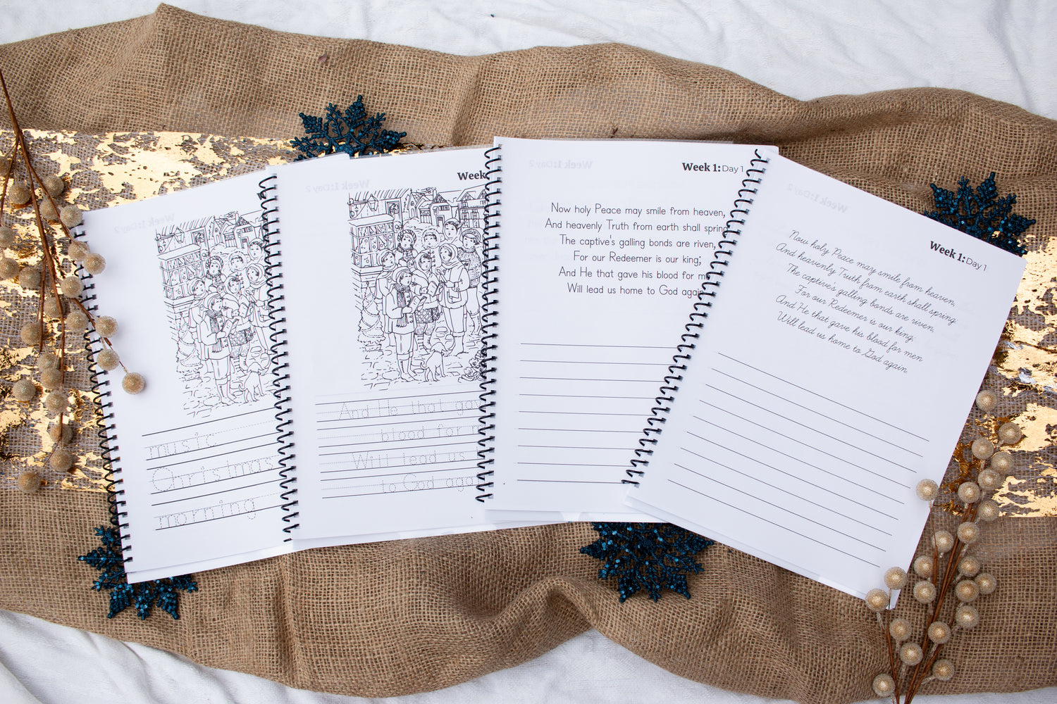 In Wonders of His Love, every lesson contains a reading from the Little Christmas Carol, an additional living picture book reading, Bible reading (reading through Jesus' entire life, death, and resurrection leading up to Christmas), prayer, one rotation subject (poetry, picture study, craft, or baking), one Christmas carol to sing, and Student Workbook page (copywork, illustrated narration, or writing prompt).